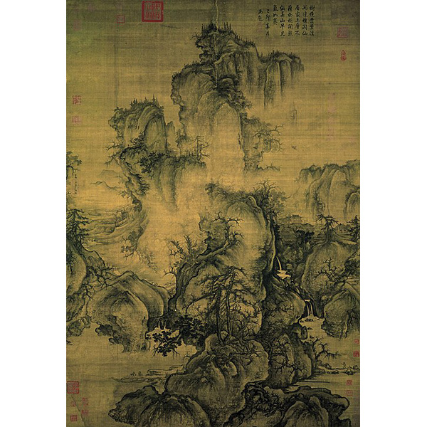 呉道子(唐、生没年不詳)は墨を自由に変化させ、墨線の豊かな表情(軽くて速い筆線に爽快さを感じさせ、重く太くゆっくりと引いた黒い線に重苦しさを感じさせたりすること)を駆使して、自分の思いと対象のもっている質感や状態を絵筆の動きに託しました。また、項容(唐、生没年不詳)は墨の濃淡によって自分が想い描く自然を画面に生み出していました。荊浩は二人の姿勢を学び、自分が目の前に見る物体を分析することで捉まえた「そのものらしさ=本質、本当のあり方、気韻」を絵筆に託して表現しようとしました。そうすれば、中国で古くから考えられている、自然を成り立たせている「気」も表現出来ると考えたのです。これが水墨山水画です。筆と墨を自由に変化させ、それが生み出す表情を用いて、着色画では描けていなかった、外観だけではなくて、画家自身が捉まえた自然の中身(本当の在り方)をも描き出す絵画として水墨山水画は成立しました。