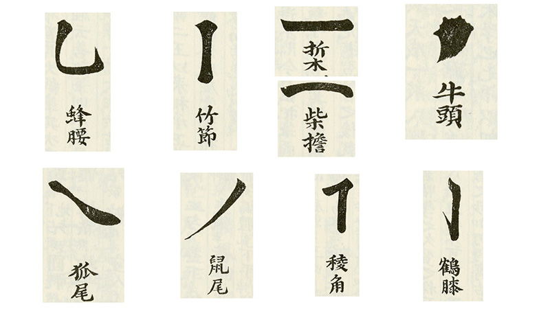 現在の書道教育、特に義務教育で行われる「書写」においては、点画は「たてかく」や「よこかく」、「はね」「はらい」など、とても簡単な名称で呼ばれています。点画の名称としてよく知られているものに永字八法がありますが、こちらは側(そく)/勒(ろく)/弩(ど)/趯(てき)/策(さく)/掠(りやく)/啄(たく)/磔(たく)という名前がついています。
