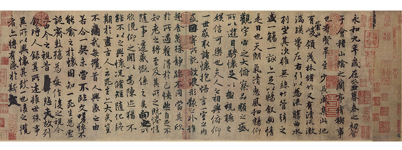 彼の代表作に、《蘭亭序》というものがあります。これは、王羲之が永和9年(353)に41人の名士を集めて催した蘭亭曲水の宴で、出席者がつくった詩をまとめたものにつけた序文の草稿(下書き)です。後日、何度も清書が試みられたが、即興で筆をとった最初のものには、はるかに及ばなかったといわれます。