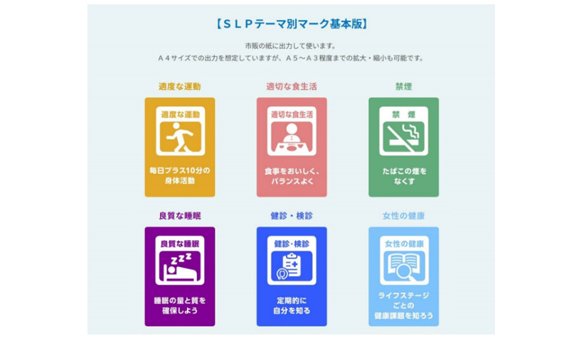 スマート・ライフ・プロジェクトとは、「健康寿命をのばそう」をスローガンに、国民全体が人生の最後まで元気に楽しみながら健康な毎日を送ることを目標とした国民運動のこと(厚生労働省HP)。これら6つのアイコン(一は運動、 二は食事、三は禁煙、四は睡眠、五は健診、六は女性の健康)は、この運動の6つの領域を普及啓発するために制作されたものです。五の健診と六の女性の健康は見ただけではわかりにくいですね。